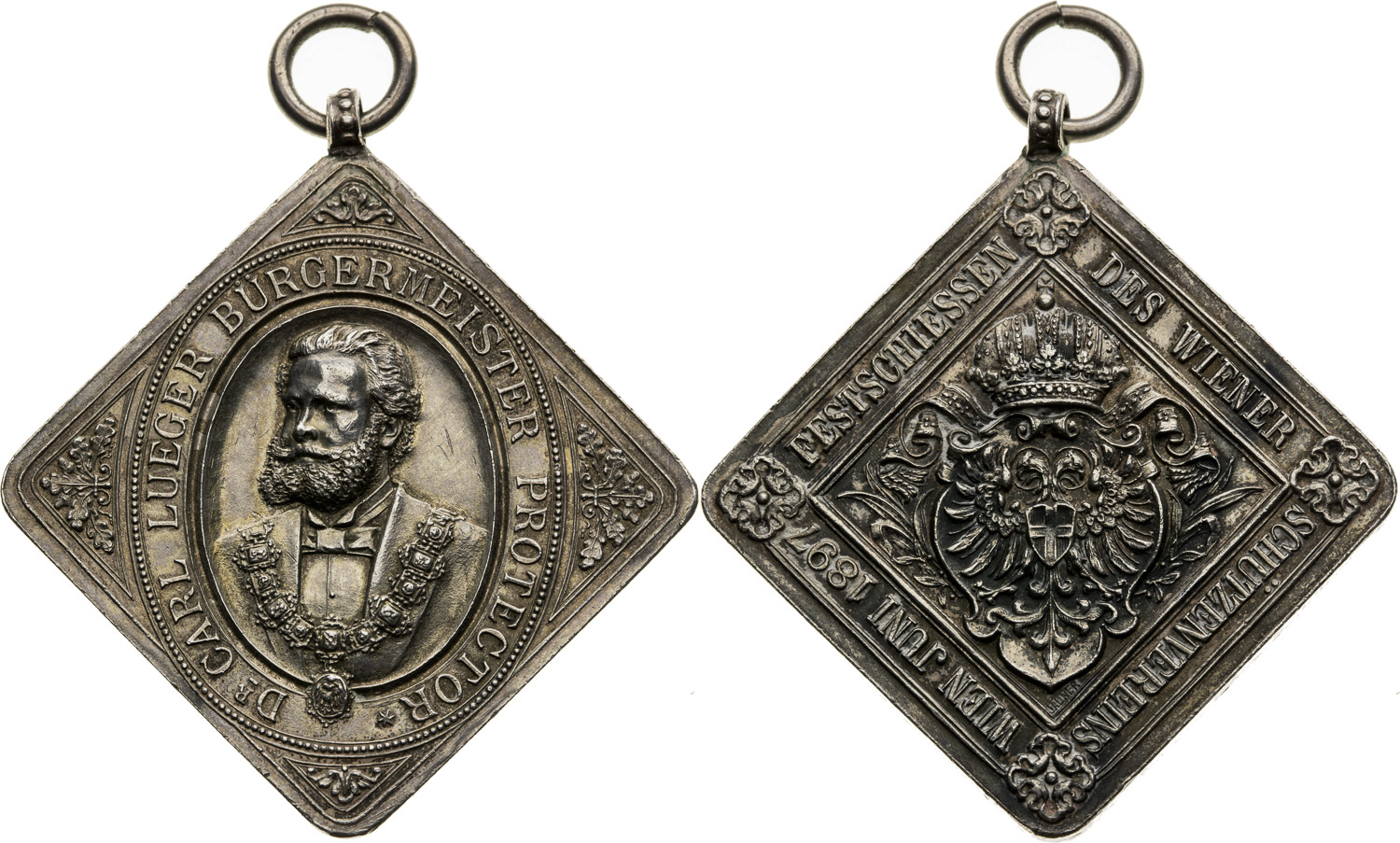 Stříbrná medaile 1897 (Klipa), Slavnostní střelecká soutěž vídeňského střeleckého spolku pod záštitou starosty Dr. Karla Luegera, Viedeň, H. Jauner, 20,6 g, 31,70x31,70 mm, Ag, Austria (2018) VI., Hauser 5202,