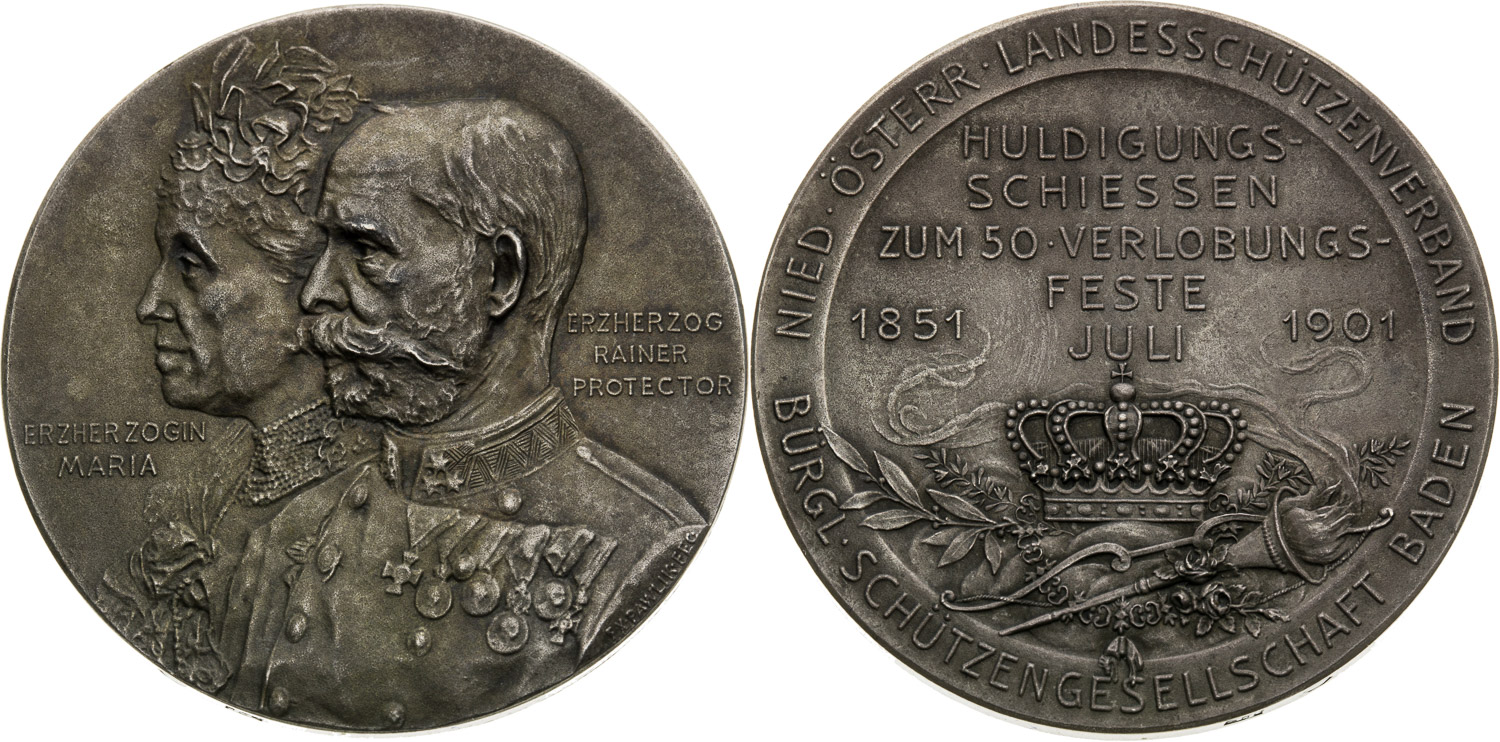 Stříbrná medaile 1901, Slavnostní střelecká exhibice k 50. výročí zasnoubení arcivévody Rainera a arcivévodkyně Marie pořádaný Dolnorakouským střeleckým spolkem a občanským spolkem střelců Baden, Viedeň, F. X. Pawlik, 22,6 g, 37,2 mm, Ag, Hauser 5262, Horsky 3720,