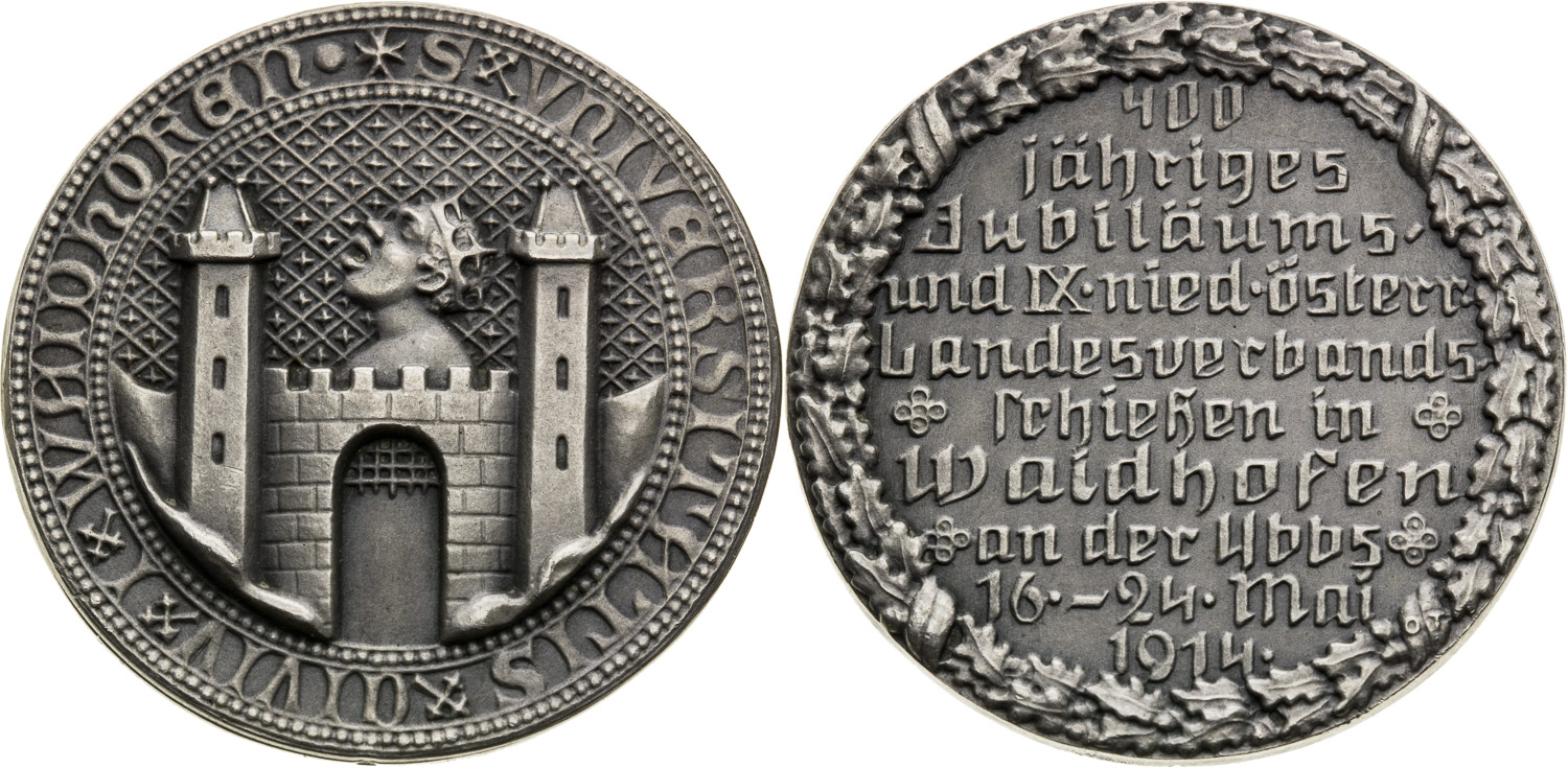 Stříbrná medaile 1914, 400. výročí a IX. dolnorakouská střelecká soutěž ve Waidhofen an der Ybbs, Viedeň, 20,25 g, 36,5 mm, Ag, Hauser -, Wurzbach -,