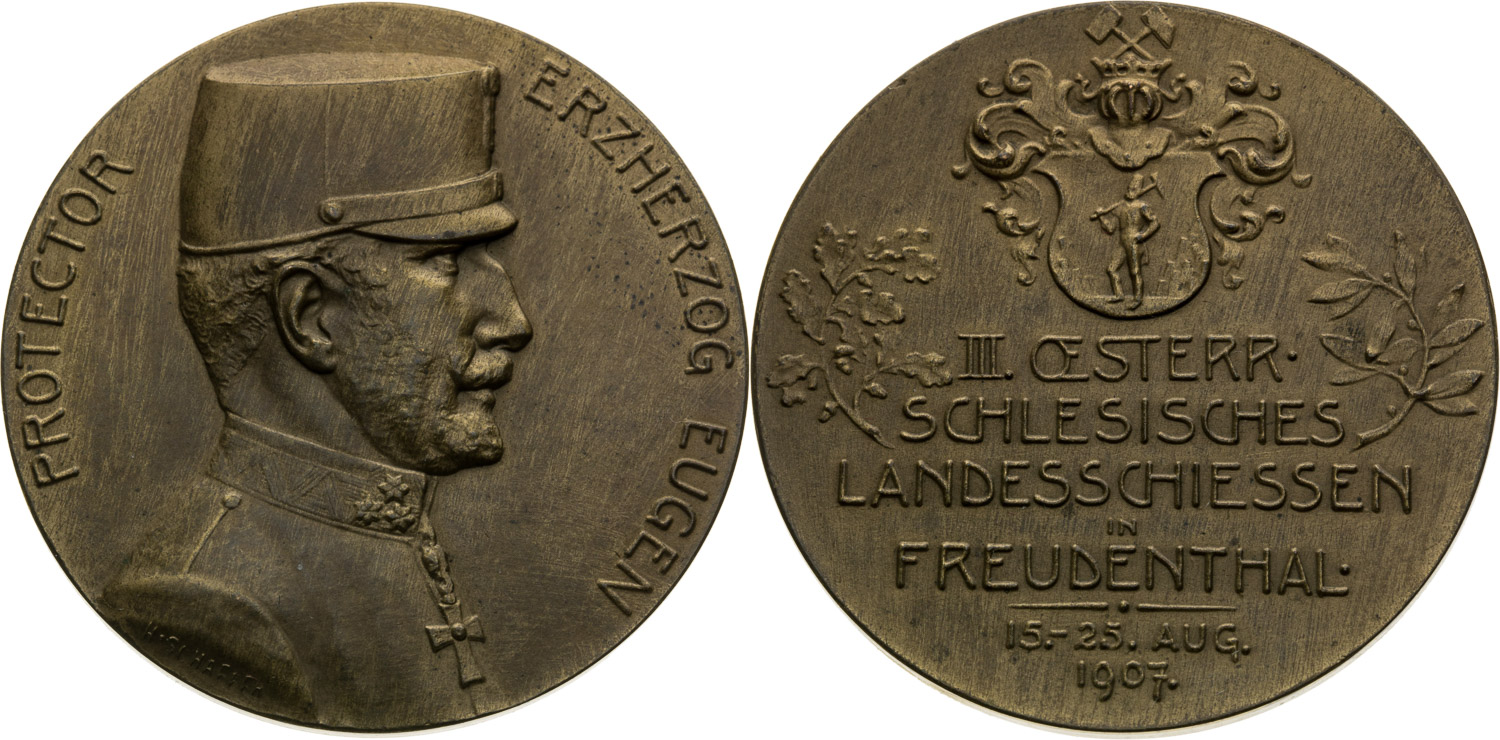 Bronzová medaile 1907, III. rakousko-slezské zemské střelby v Bruntálu, Viedeň, H. Schäfer, 17,26 g, 35,1 mm, Bronz (Bronze), RR! Velmi vzácný!, Austria (2018) XXXXIV. (Ag),
