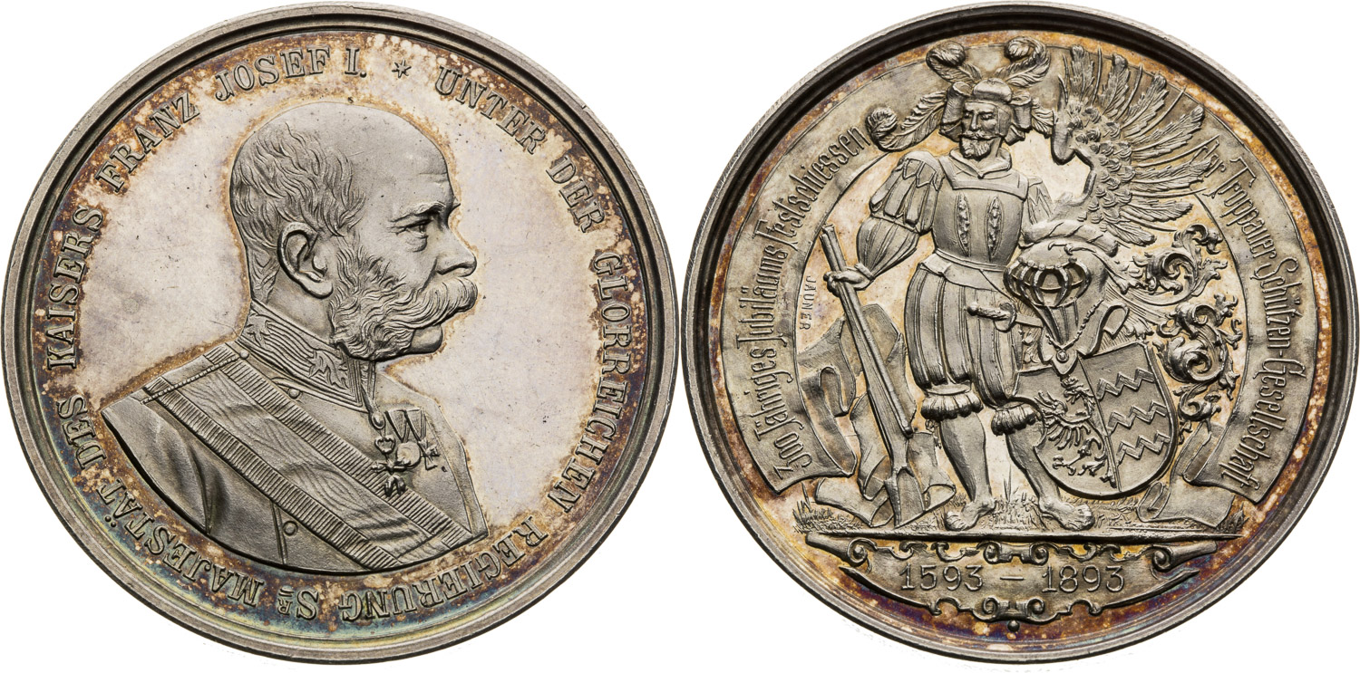 Stříbrná medaile 1893 (2 Zlatník), 300. výročí založení střeleckého spolku v Opavě, Viedeň, H. Jauner, J. Christelbauer, 23,43 g, 36,40 mm, Ag, R! Vzácný!, Hauser 5184, Horsky 3863, Wurzbach 2549,