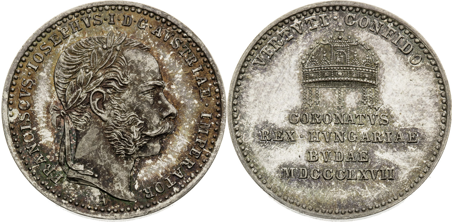 Stříbrný žeton 1867, Korunovace na uherského krále v Budíně, Viedeň, J. Tautenhayn, F. Gaul, 3,29 g, 20,3 mm, Ag, Ex Horn collection, Novák V-XIX-B-4b, Montenuovo 2712, Frühwald II./3b, Hauser 824,