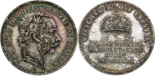 Stříbrný žeton 1867, Korunovace na uherského krále v Budíně, Viedeň, J. Tautenhayn, F. Gaul, 5,5 g, 23,5 mm, Ag, Ex Horn collection, Novák V-XIX-B-5b, Horsky 3795, Montenuovo 2709, Frühwald II./5b, Hauser 826,