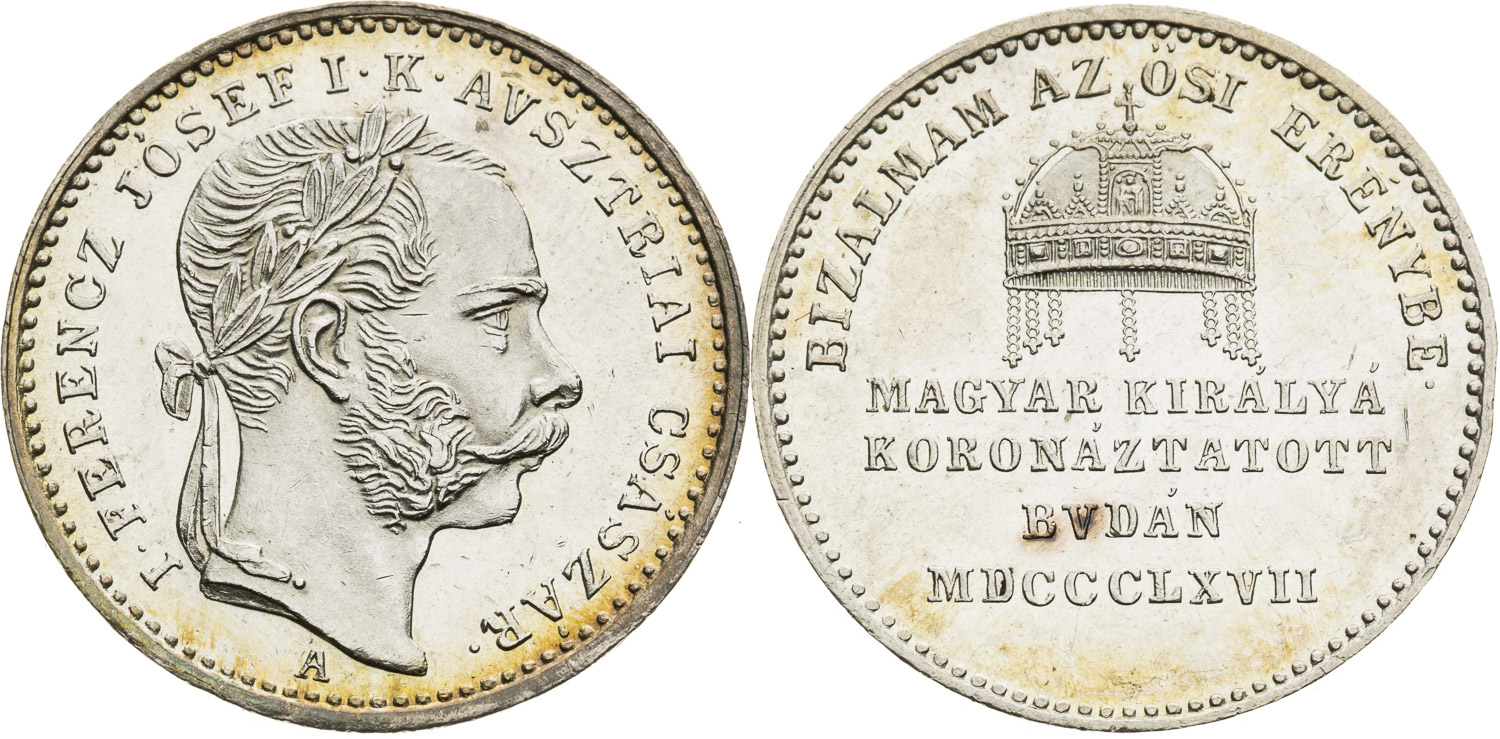 Stříbrný žeton 1867, Korunovace na uherského krále v Budíně, Viedeň, J. Tautenhayn, F. Gaul, 3,3 g, 20,3 mm, Ag, Novák V-XIX-B-6b, Horsky 3795, Montenuovo 2710, Frühwald II./6b, Hauser 827,