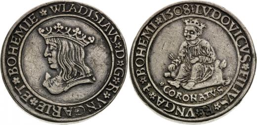 Ludvík Jagelonský Stříbrná medaile 1508, Korunovace na uherského krále, Kremnica, 19,78 g, 30-31 mm, Ag, Huszár-Procopius 4, Tlustý odražek.Pozdější ražba (19.-20. století).