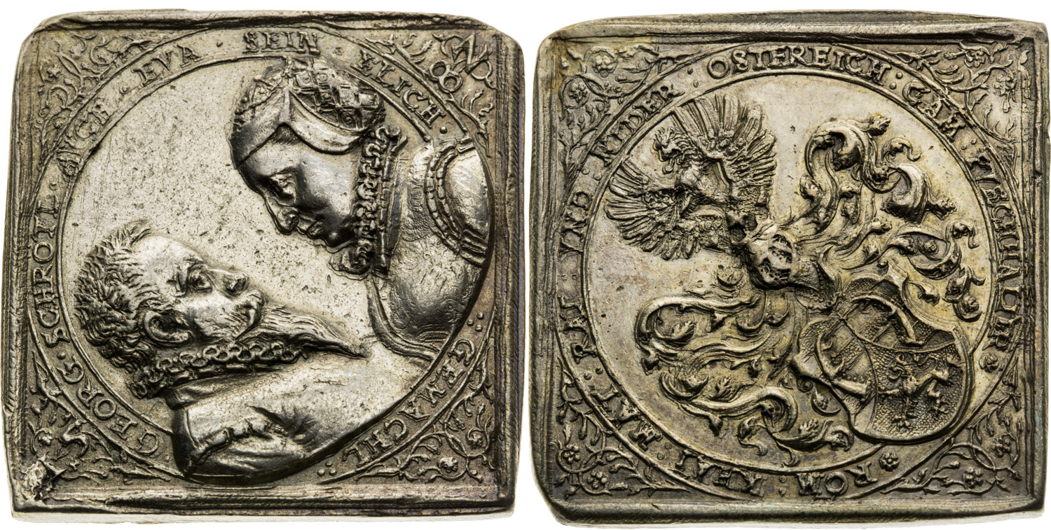 Rudolf II. Stříbrná medaile (klipa) 1582, Georg Schrötl von Schrotenstein a jeho žena Eva, císařský rada a puchhaltéř dolnorakouské komory, Kremnica, Abraham Eisker, 50,09 g, 39x39 mm, Ag, R! Vzácná!, Huszár-Procopius 68, Horsky 7635, Nepatrná stopa po uchu.