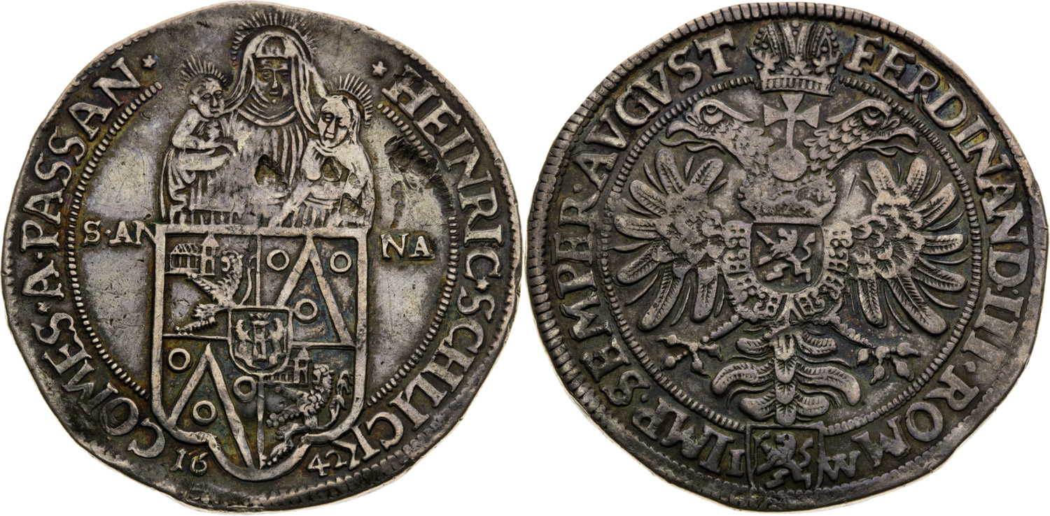 Jindřich Šlik Tolar 1642, S titulem Ferdinanda III., Planá, Johann Wodniansky , 28,92 g, 44 mm, Ag, Donebauer 3816, Fiala 250 var., Davenport 3404, Pavlíček-Schön XXI.102, Smetana-Jakymenková W11, Chyba střížku.Stopa po uchu.