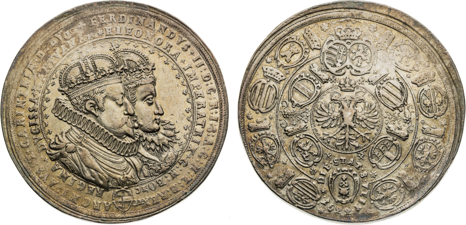 Ferdinand II. Stříbrná medaile 1622 (2 1/4 Tolar), Ke sňatku s Eleonorou von Mantua, St. Veit / Klagenfurt, Donat Starckh, 64,20 g, 50-51 mm, Ag, MA 1622A, Herinek 1713 (58,49 g), Montenuovo 753 (71,5 g),