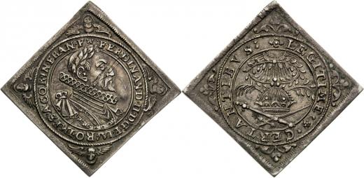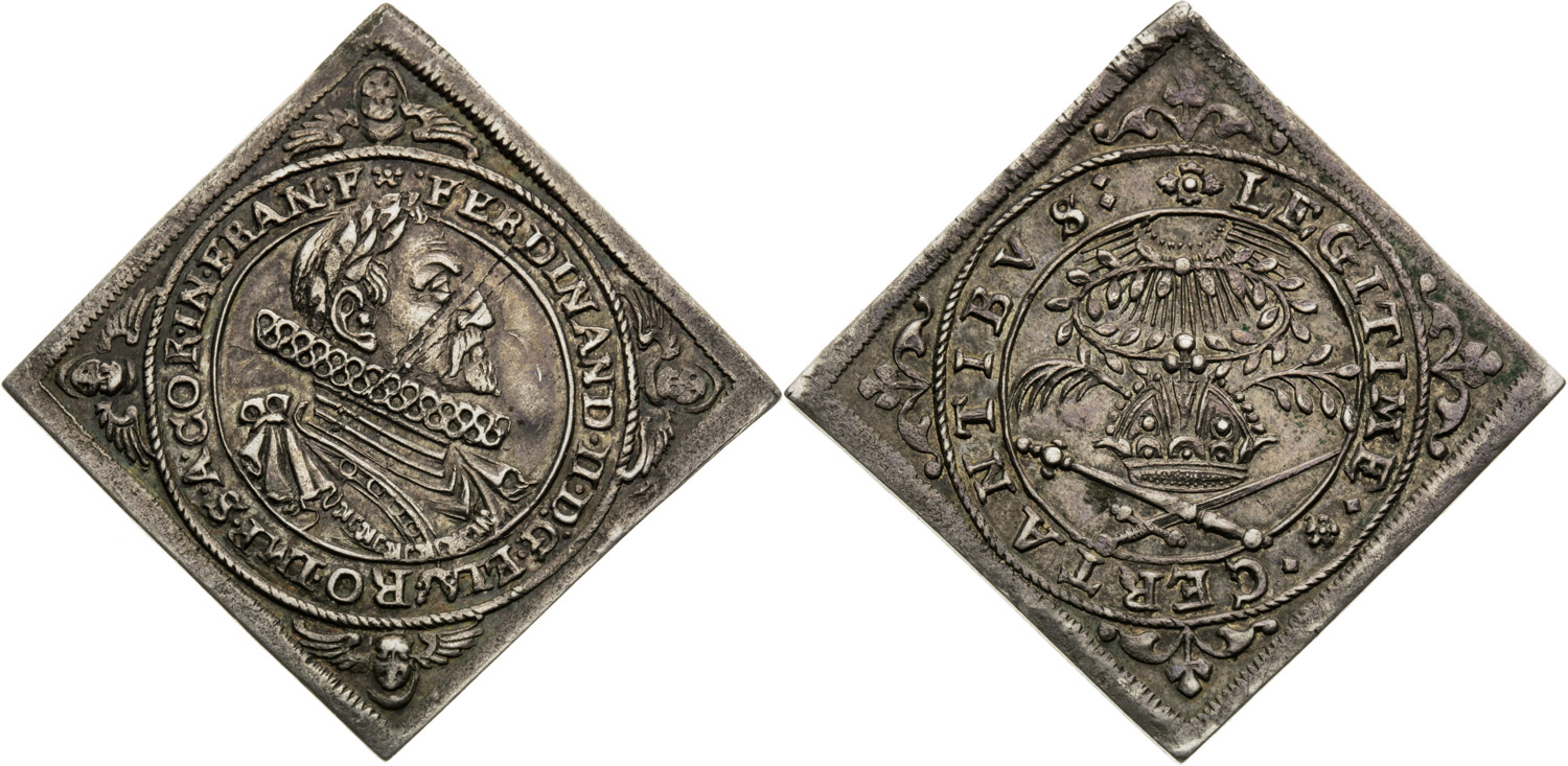 Ferdinand II. Stříbrná medaile (klipa) (1619), Korunovace na římského císaře ve Frankfurtu, 3,16 g, 23 x 23 mm, Ag, R! Vzácná!, Förschner 59.3, Joseph-Fellner 348, Friedberg 964-965 (AV), Chyba střížku.Pěkná patina.