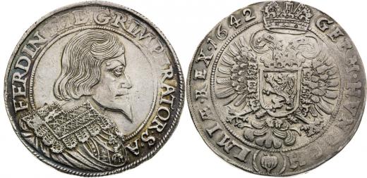 Ferdinand III. Tolar 1642, Jáchymov, David Knobloch, 28,86 g, 44 mm, Ag, RR! Velmi vzácný!, Janovský 13, MA 1642, Davenport 3208, Dietiker 809, Halačka 1208, Mírně nedoražený.