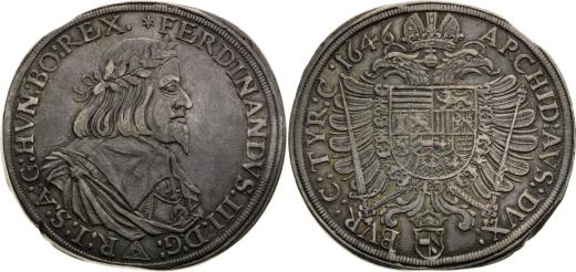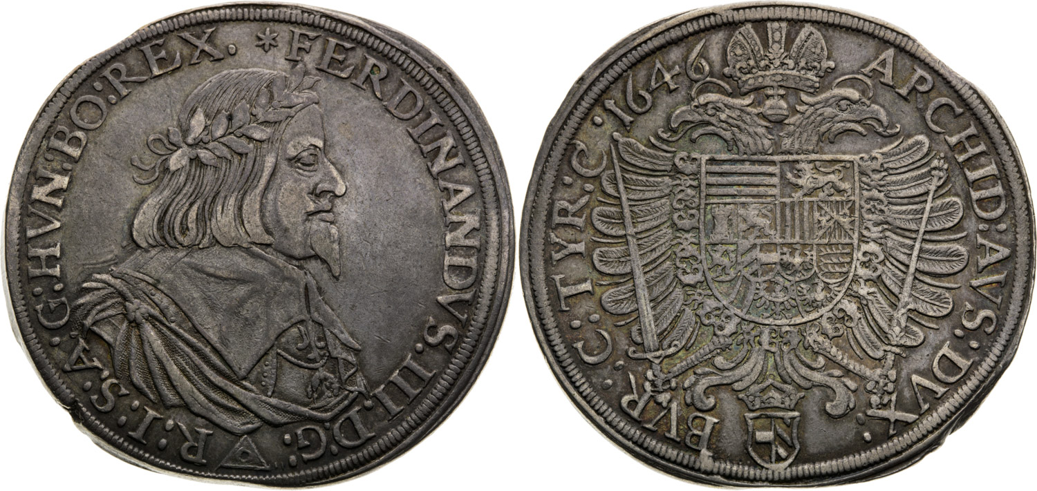 Ferdinand III. Tolar 1646, Brno, Jan Konrád Richthausen, 28,61 g, 41-42 mm, Ag , R! Vzácný!, Davenport 3216, Voglhuber 191/I, Halačka 1234, Pěkná patina.