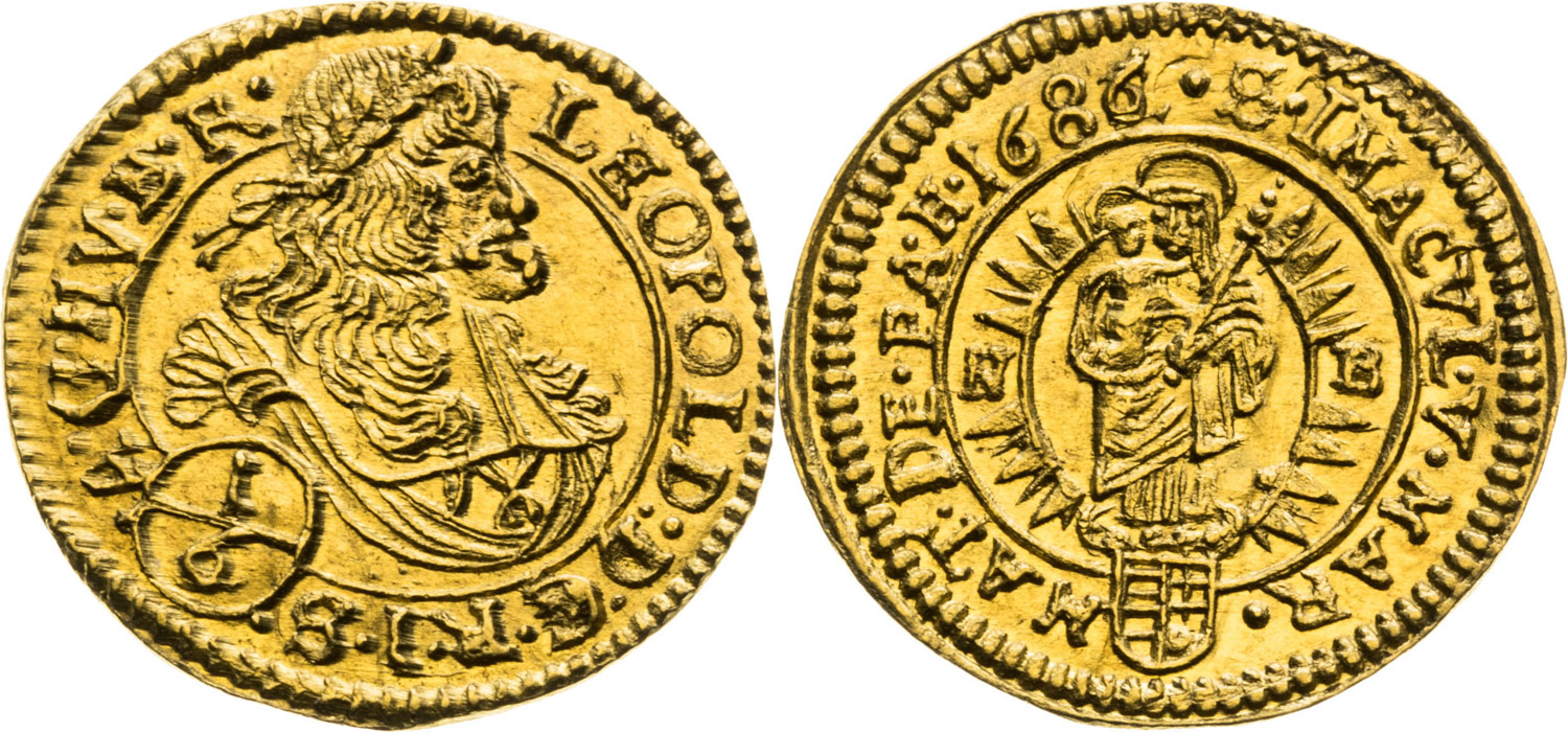Leopold I. 1/6 Dukát 1686, Nagybánya, Peter Österreicher, 0,57 g, 13,5 mm, Au, Huszár 1343, Unger II. 1007.b, Friedberg 154,