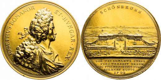 Josef I. Zlatá medaile (25 Dukát), Na výstavbu zámku Schönbrunn, Viedeň, Wolffgang, 82,67 g, 49,5 mm, Au, RRR! Extrémně vzácná!, HMA Wien 33, Oficiální pozdější ražba Hlavního mincovního úřadu Vídeň. Značka HMA i punc na hraně odstraněn.Podle zjištění aukčního domu se na trhu vyskytly pouze 2 kusy!