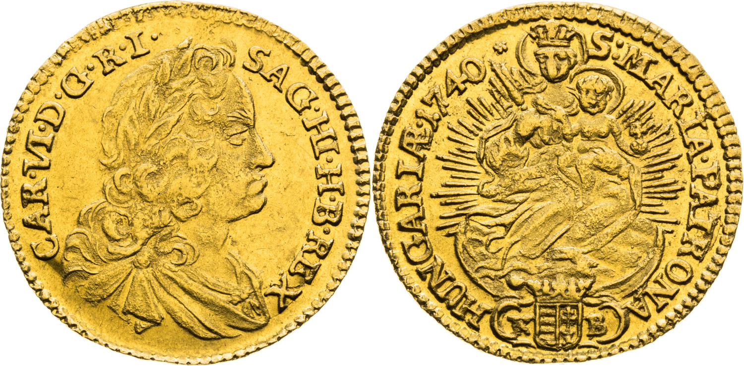 Karel VI. Dukát 1740, Nagybánya, 3,46 g, 22,11 mm, Au, Huszár 1593, Unger II. 1173, Herinek 192, Friedberg 175,