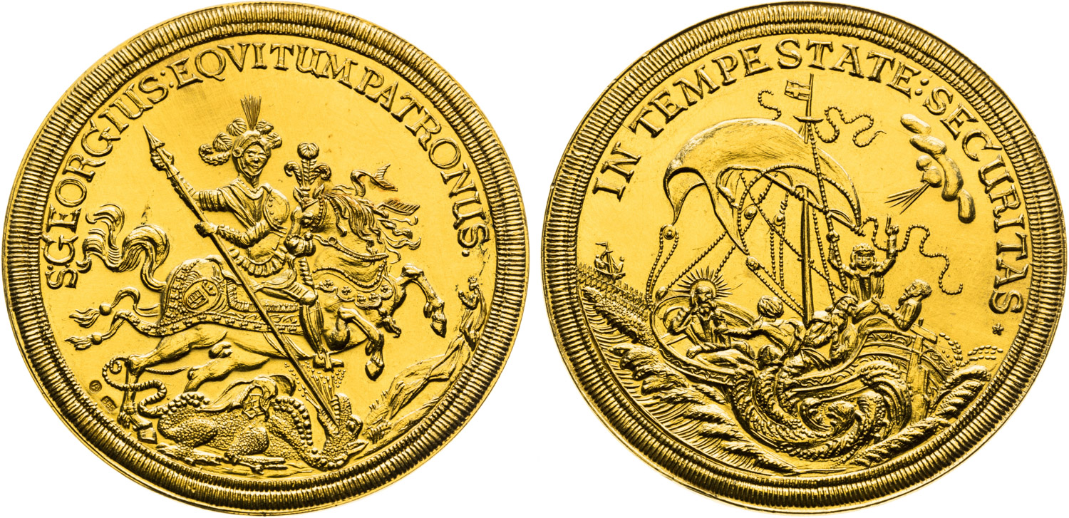 Karel VI. Zlatá medaile (7 Dukát), Motiv svatého Jiří, 24,23 g, 38,10 mm, Au, R! Vzácná!, Huszár-Procopius -, Huszár Szent György Érmek -, Pozdější ražba, nesprávně připisovaná Jeremiášovi Rothovi, Kremnica. Nepublikovaný typ!Puncovaná 585