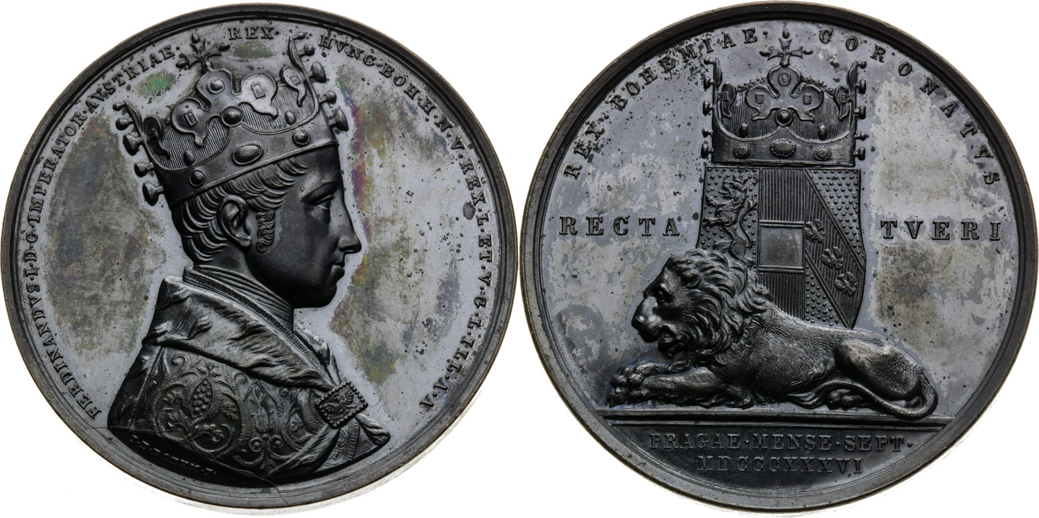 Ferdinand V. Medaile 1836, Korunovace na českého krále v Praze, Josef Daniel Boehm, 56,66 g, 47 mm, Cu, R! Vzácná!, Frühwald 124-1d, Novák XVIII-D-1c, Donebauer 3135, Montenuovo 2556, Horsky 3618, Sbírkový kus s nádhernou patinou.