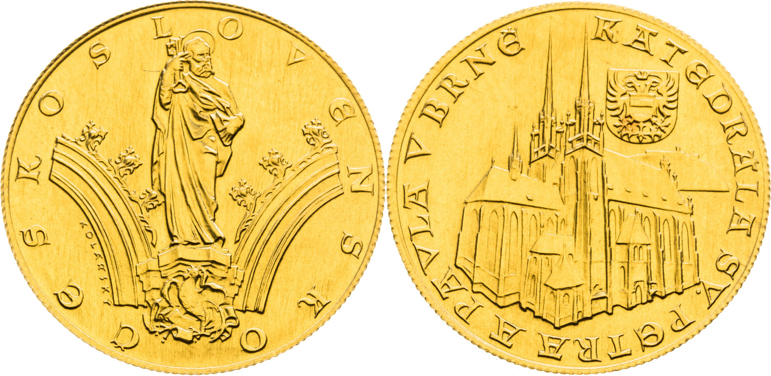ČSSR (1960-1989) Zlatá medaile 1973 (Dukát), Katedrály - Katedrála sv. Petra a Pavla v Brně, Kremnica, Z. Kolářský, 3,49 g, 20 mm, Au, R! Vzácná!, M&CH CSSR-MED10, Raženo 300 ks.