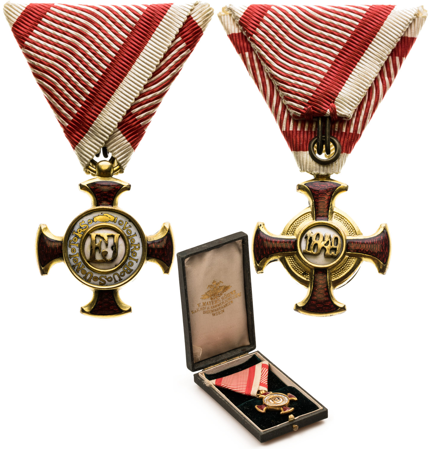 Rakousko - Uhersko Záslužný kříž, Bez koruny na vojenské stuze, Bronz (Bronze), Marko.139l, Původní krabička.Pozlácený.