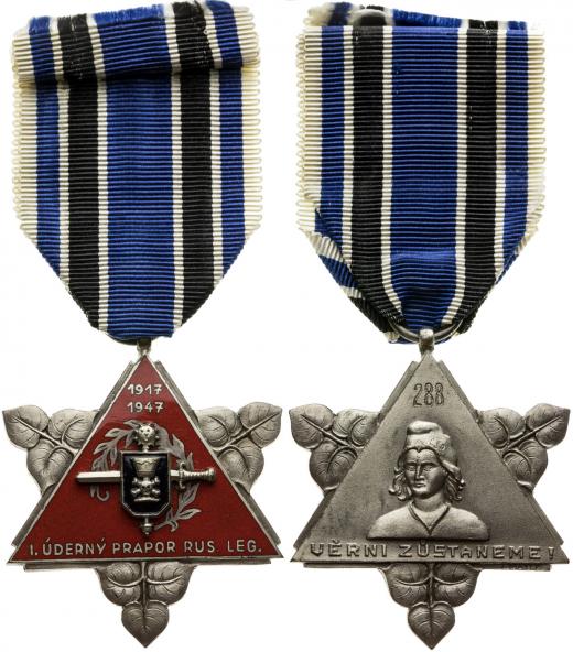 ČSR (1918 - 1948) Pamětní medaile 1. úderného praporu ruských legií, Karnet-Kyselý Praha, J. Mayer, Bronz (Bronze), R! Vzácná!, Novotný 65, VM-100, Postříbřená. Původní krabička. #288. Celkem bylo vydáno 500 kusů těchto medailí. Jsou označeny matričním číslem (zde 288). Medaile byly rozděleny kromě nejvýznamnějších politických osobností mezi bývalé příslušníky praporu, osoby zasloužilé o tradici útvaru, osoby se vztahem ke Kulikovského úderné baterii a Kornilovovu slovanskému údernému praporu.