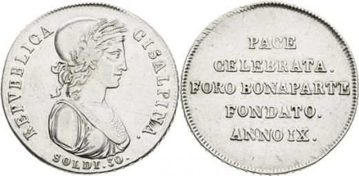 30 Soldi (1801), Cisalpínská republika. Mince na památku míru z Luneville, Miláno, 7,24 g, 29 mm, Ag, Pagani 9, CNI 2, Mill. 149, Gnechi 1,