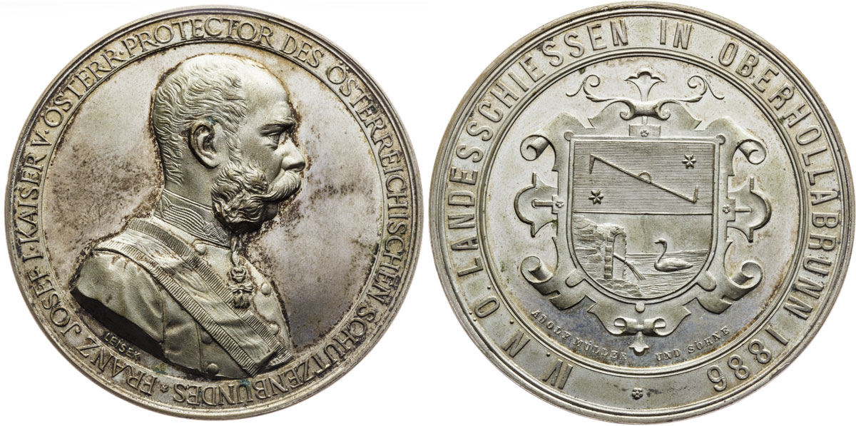Strelecká medaila Oberhollabrunn 1886.; Kvalita: UNC; Mincovna: Viedeň; Váha: 93,9 g; Průměr: 60,6 mm; Reference: Hauser: 5132; Poznámka: Etue, R! vzácna.