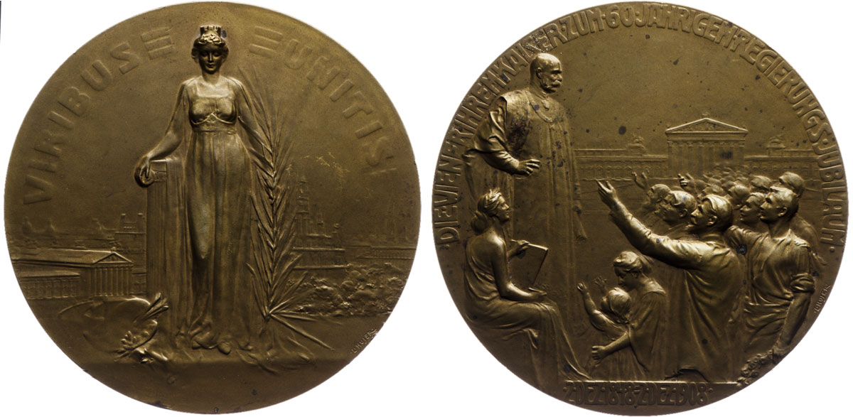 Medaila na 60. výročie panovania Františka Jozefa I. 1908.; Kvalita: Good EF; Mincovna: Viedeň; Váha: 199,4 g; Průměr: 84,6 mm; Reference: Hauser:1035, Wurzbach:2036.; Poznámka: Hranky.