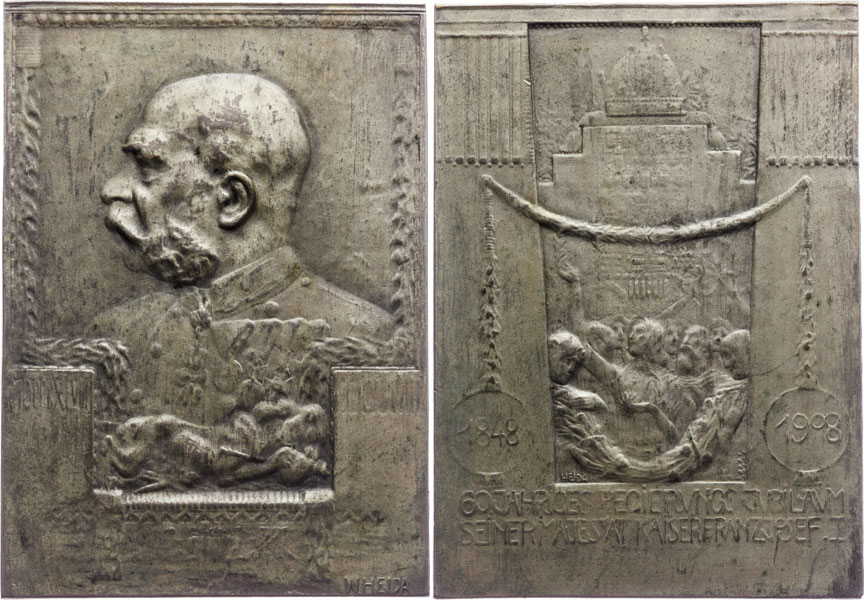 Medaila na 60. výročie panovania Františka Jozefa I. 1908 Prijepolje.; Kvalita: EF; Mincovna: Viedeň; Váha: 128,4 g; Průměr: 57x80 mm; Reference: ako Wurzbach:2637; Poznámka: Punc: GESETZLICH GESCHÜTZT - UNECHT.