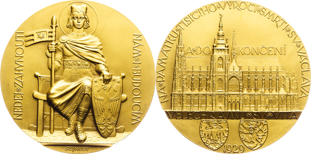 Zlatá medaila Svätý Václav - Dokončenie velechrámu Sv. Víta v Prahe1929.; Kvalita: UNC; Mincovna: Kremnica; Váha: 168,8 g; Průměr: 70,4 mm; Reference: N.(2012): VII. A; Poznámka: Škrabanec, puncované na hrane 987., Razených iba 179 kusov, RRR! Extrémne vzácna, etua..