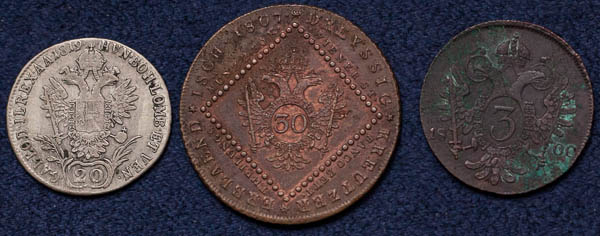 Mince (3 ks), 30 Kr. 1807S, 20 Kr. 1819E, 3 Kr. 1800B