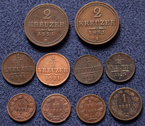 Měděné mince (10 ks), 2 Kr. 1851A, 2 Kr. 1851B,1 Kr. 1881, 1/2 Kr. 1851A, 1/2 Kr. 1851A, 1/4 Kr. 1851A, 1/4 Kr. 1851B, 5/10 Kr. 1859V, 5/10 \Kr. 1864B, 5/10 Kr. 1885