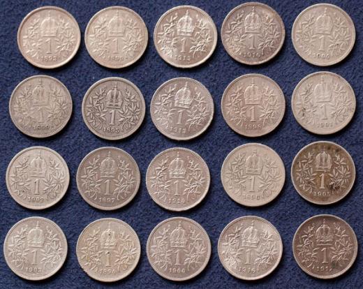 Korony (20 ks), 1893, 1894, 1895, 1896, 1897, 1898, 1899, 1899, 1900, 1901, 1902, 1903, 1904, 1905, 1912, 1913, 1914, 1915, 1916, 1916