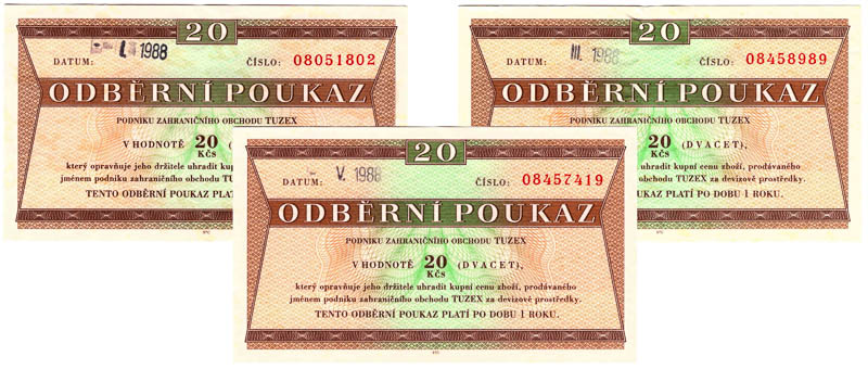 20 TKčs Odběrní poukaz Tuzex 1988 (3 ks)