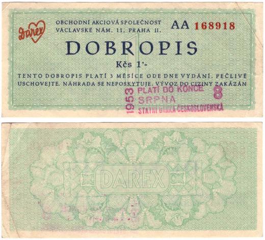 1 Kčs Darex (Dobropis), Razítko Státní banka československá, platnost do konce srpna 1953