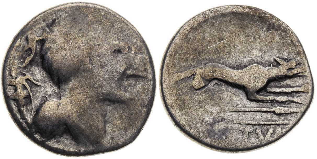 Av.: Hlava Diany doprava Rv.:Pes ve skoku doprava, dole ležící kopí, v exergu SIOSAV