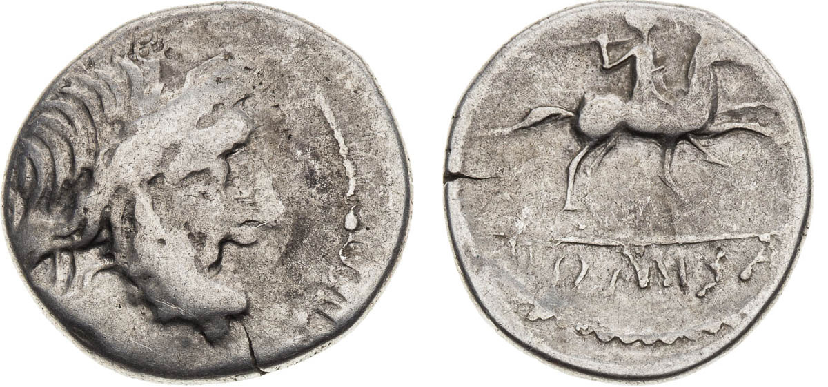 Av.: Hlava Jupitera doprava Rv.:Jezdec s kopím doprava, v exergu DOMISA