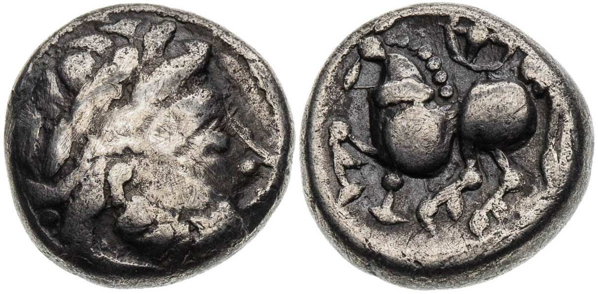 Av.: Vousatá hlava s vavřínovým věncem doprava Rv.:Kůň doleva s hřívou z kuliček, nahoře kolo s loukotěmi