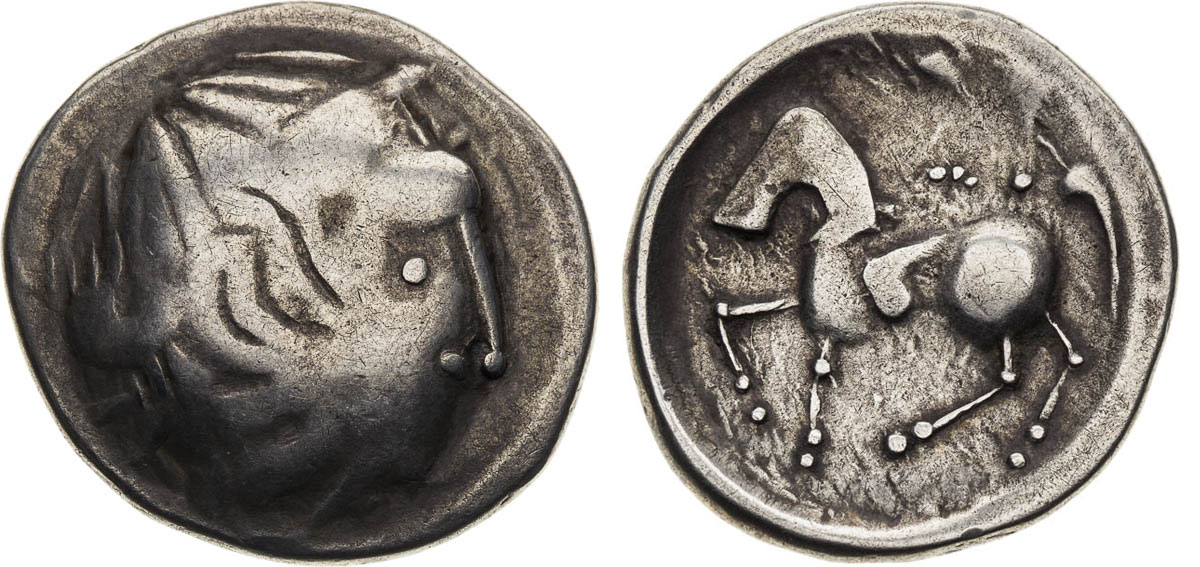 Av.: Vousatá hlava s diadémem doprava Rv.:Silně stylizovaný jezdec doleva