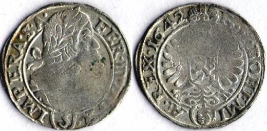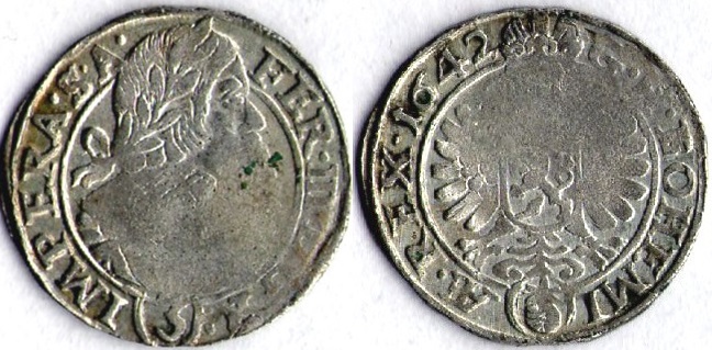 3.krejcar 1642, Praha - Wolker, MKČ 1181, var opisu v Rev: BOHEMI, střed mírně nedoražen, patina
