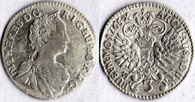 3 krejcar 1765, Praha - Erdmann, MKČ 1973, .1,57g, v Rev mírně just