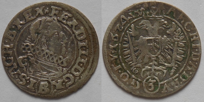 3.krejcar 1624, Brno - Wonsiedler, MKČ 886, Av: FERDI.II.D.GR, B v perlič závorce, I.S.A.G.H.B.REX květ. Rev: ARCHI.D..A.D.BV 3 v kroužku G.O.TY.16Z4 CW, chyboražba G místo C, mělká ražba