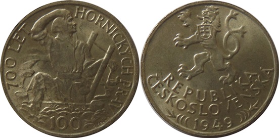 100 Kčs 1949 - Nov.47, 700.výročí jihl hornického práva, O.Španiel, Ag(500/1000), 14g