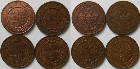 1 Kopějka 1911, 13, 14 a 15 - Petrohrad, ...4ks