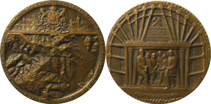 Medaile k proražení tunelu Brasov-Buzau 1926, Bronz 40mm, Av.Plast ztvárnění krajiny s trasou tunelu, Rev.Postavy horníků v tunelu opis...! Vynikající medailérské zpracování !