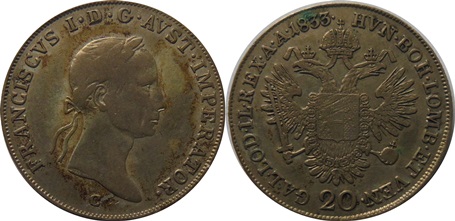 20 krejcar 1833, Praha - Hippmann, MKČ 2040, dr škr v ploše, patina,