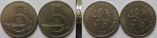 5 Kč 1938 - Nov.10, obě varianty s normální a s obrácenou vlnovkou na hraně ...2ks