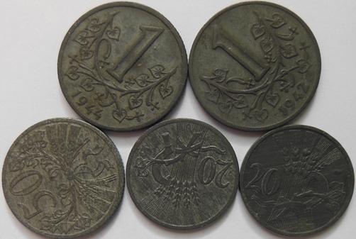 1 Kč 1942 a 1944 Nov.23, 50 hal 1941 Nov.22 a 20 hal 1941 a 1942 Nov.21...5ks