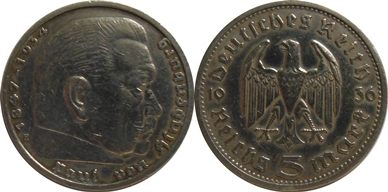 5 Mark 1936 E - Hindenburg, KM.86, Ag 13,88g(900/1000),