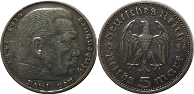 5 Mark 1936 A - Hindenburg, KM.86, Ag 13,88g(900/1000), patina