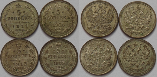 Mikuláš II. 1894-1917 - 5 Kopějek 1905 SPB/AR, 1908 SPB/EB, 1911 SPB/EB