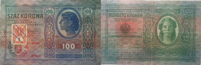 100 Korun 1912, 165x108mm, BHK-5, s. 2141, stříhaný kolek 1Kč-přeškrtán tužkou